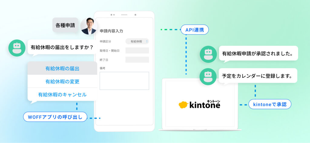 有給休暇等の各種社内申請にBotとWOFFを活用いただいています。kitnoneをデータベースに、入力画面をWOFFで作成し、LINE WORKS上から申請できるようにしています。