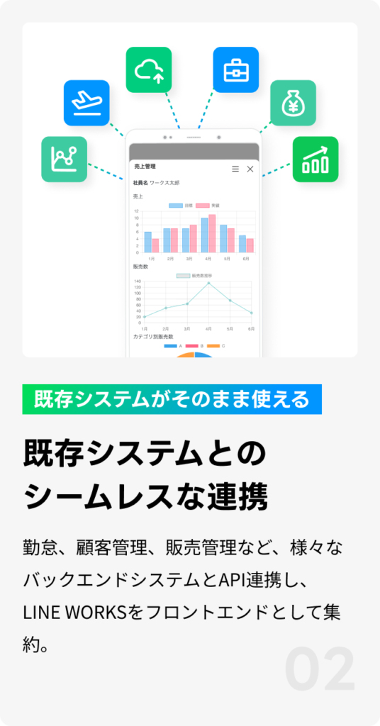 LINE WORKSを通してさまざまなシステムと接続。フロントエンド(操作画面)がLINE WORKSに集約され、利便性アップ!